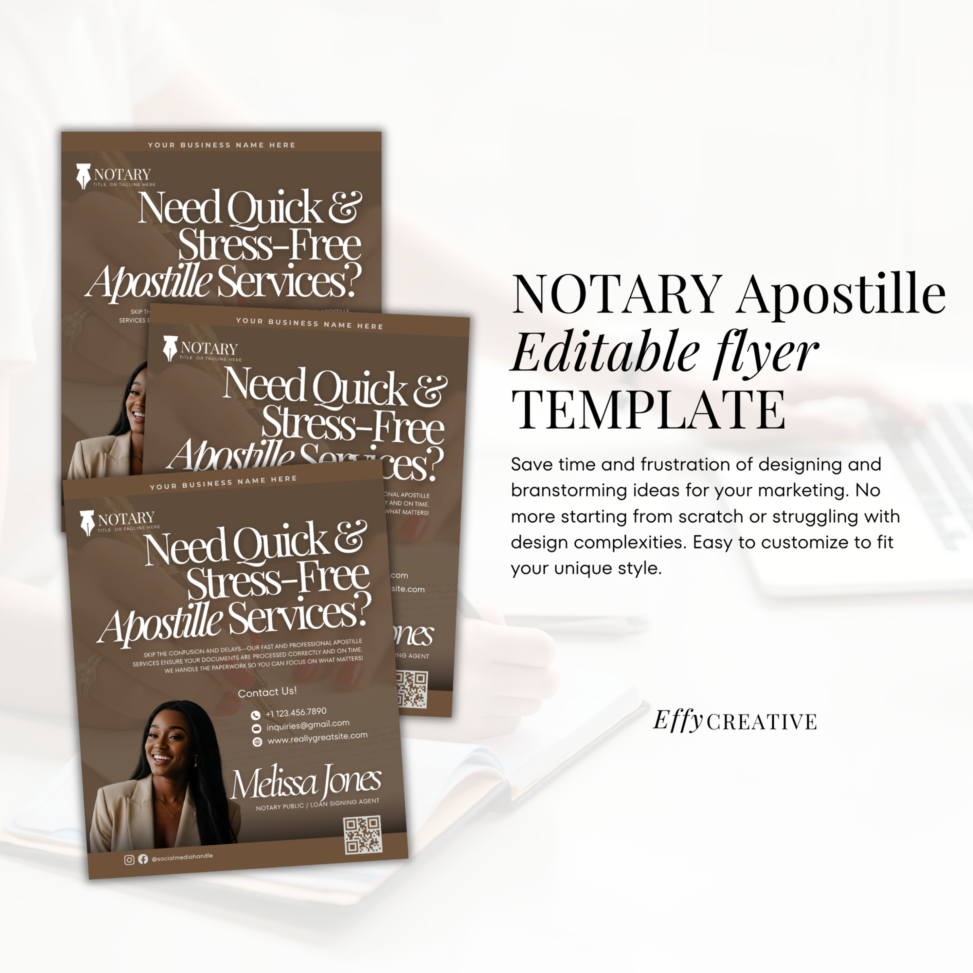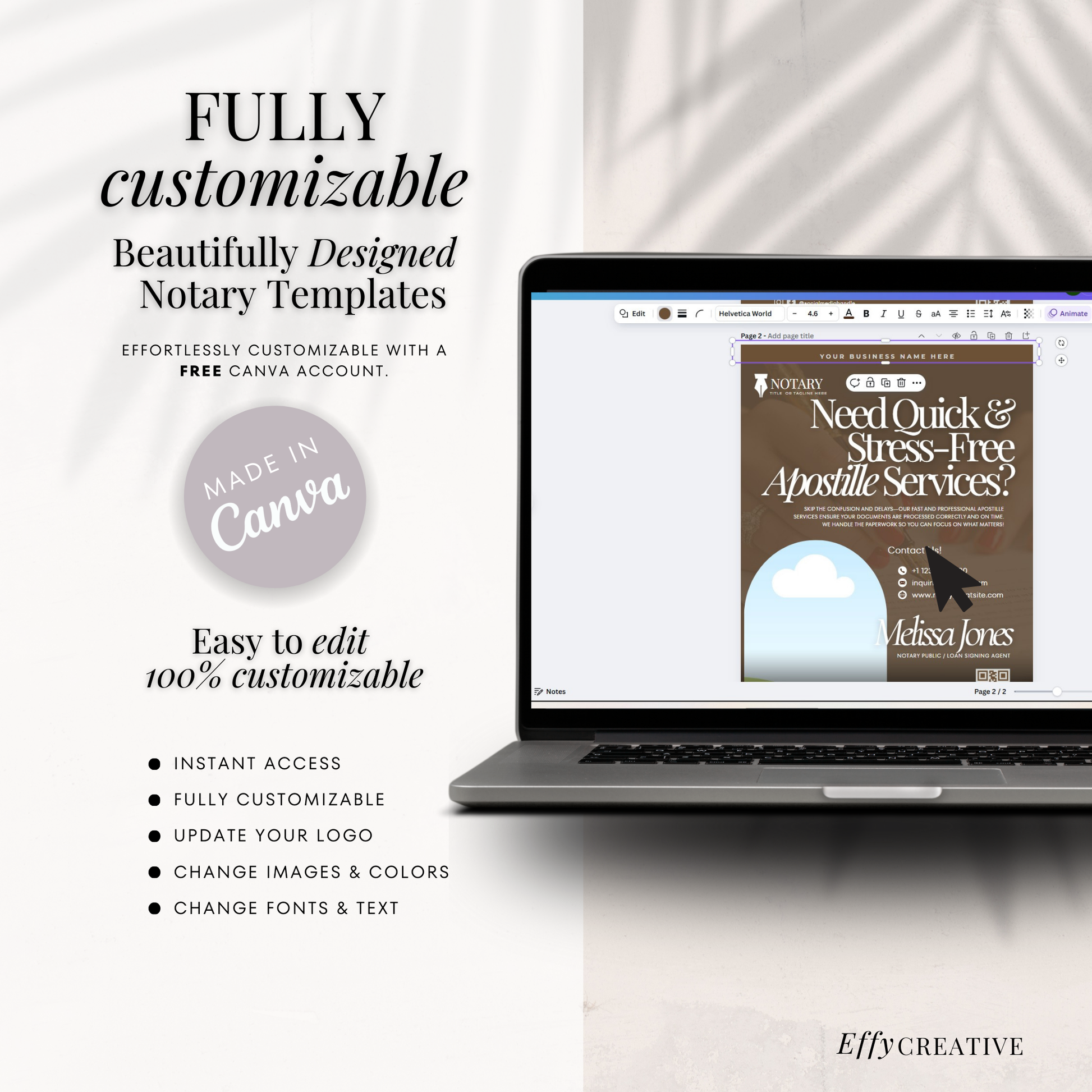 🤍 This self-customizable Canva editable template is designed for notaries, apostille agents, and small business owners looking to promote their services with ease and professionalism. Whether you're offering apostille services, mobile notary work, or loan signings, this customizable 4:5 digital flyer helps you create a sleek and polished look that attracts clients.