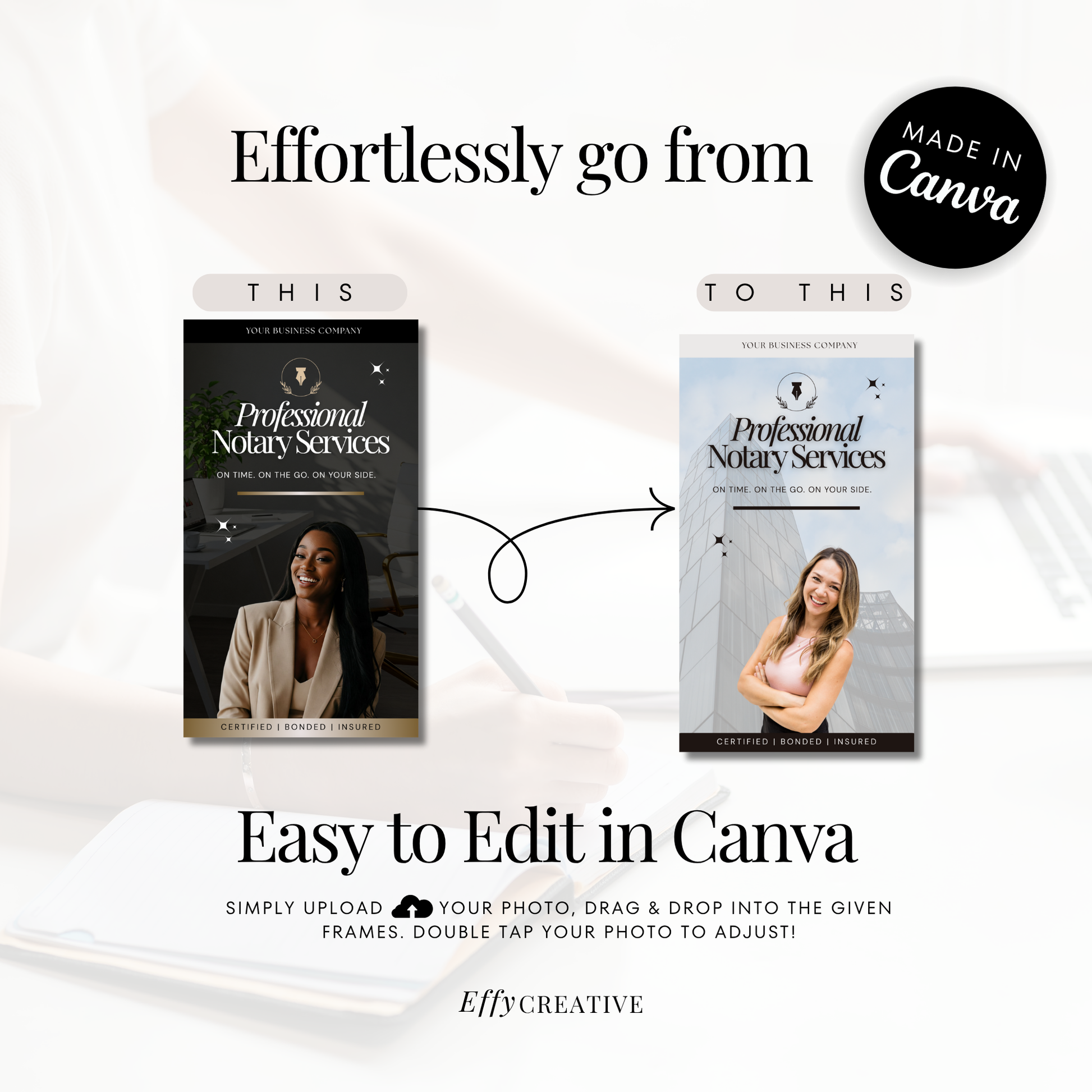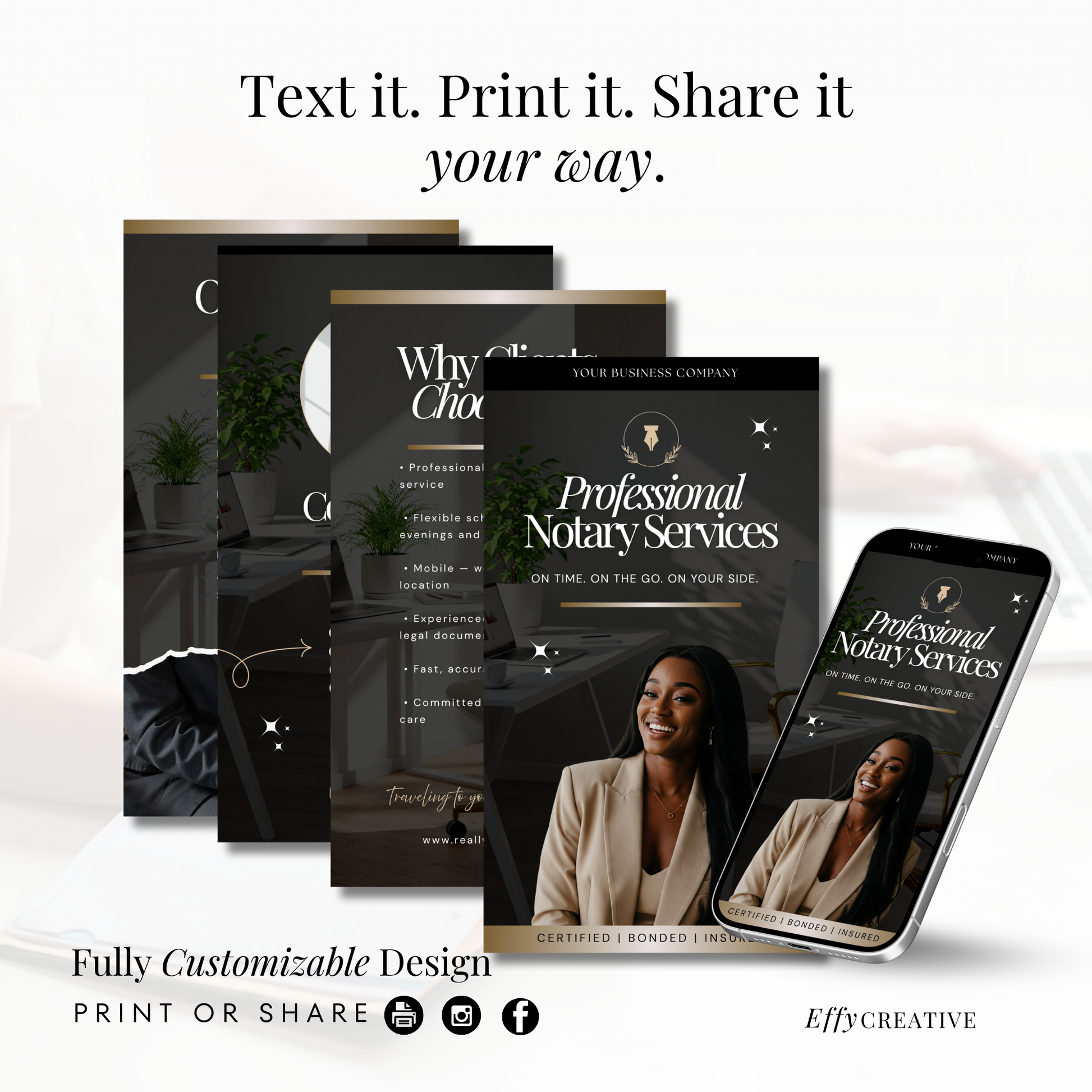 🤍 Designed to help you stand out in seconds, this digital business flyer is made for notaries who want to show up online with style and motion. Whether you're texting clients, posting on Instagram, or sharing in Facebook stories — this flyer makes you look professional, modern, and unforgettable. This digital template is editable in Canva and can be used as a PNG, PDF or MP4 for Posting, texting, emailing, or printing.