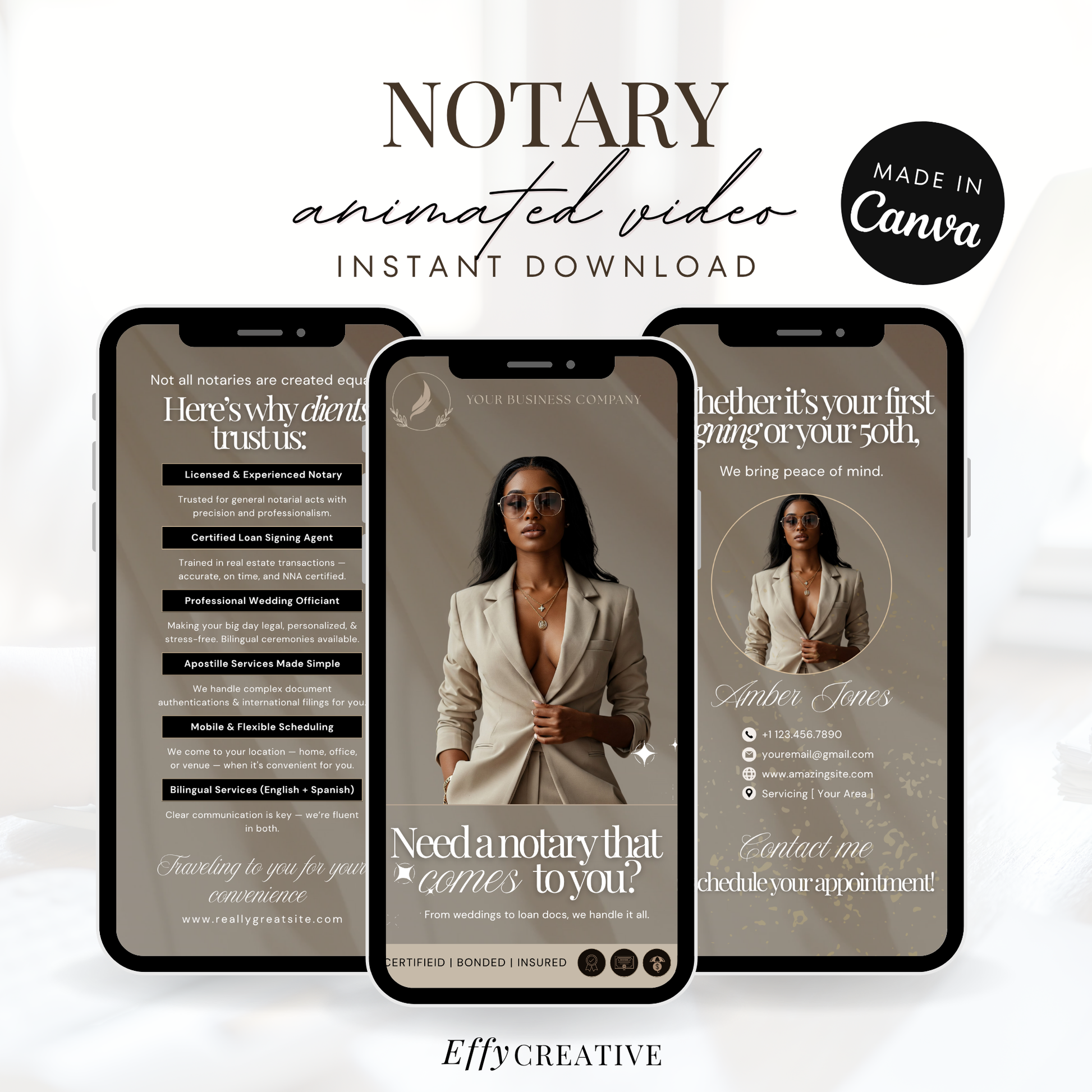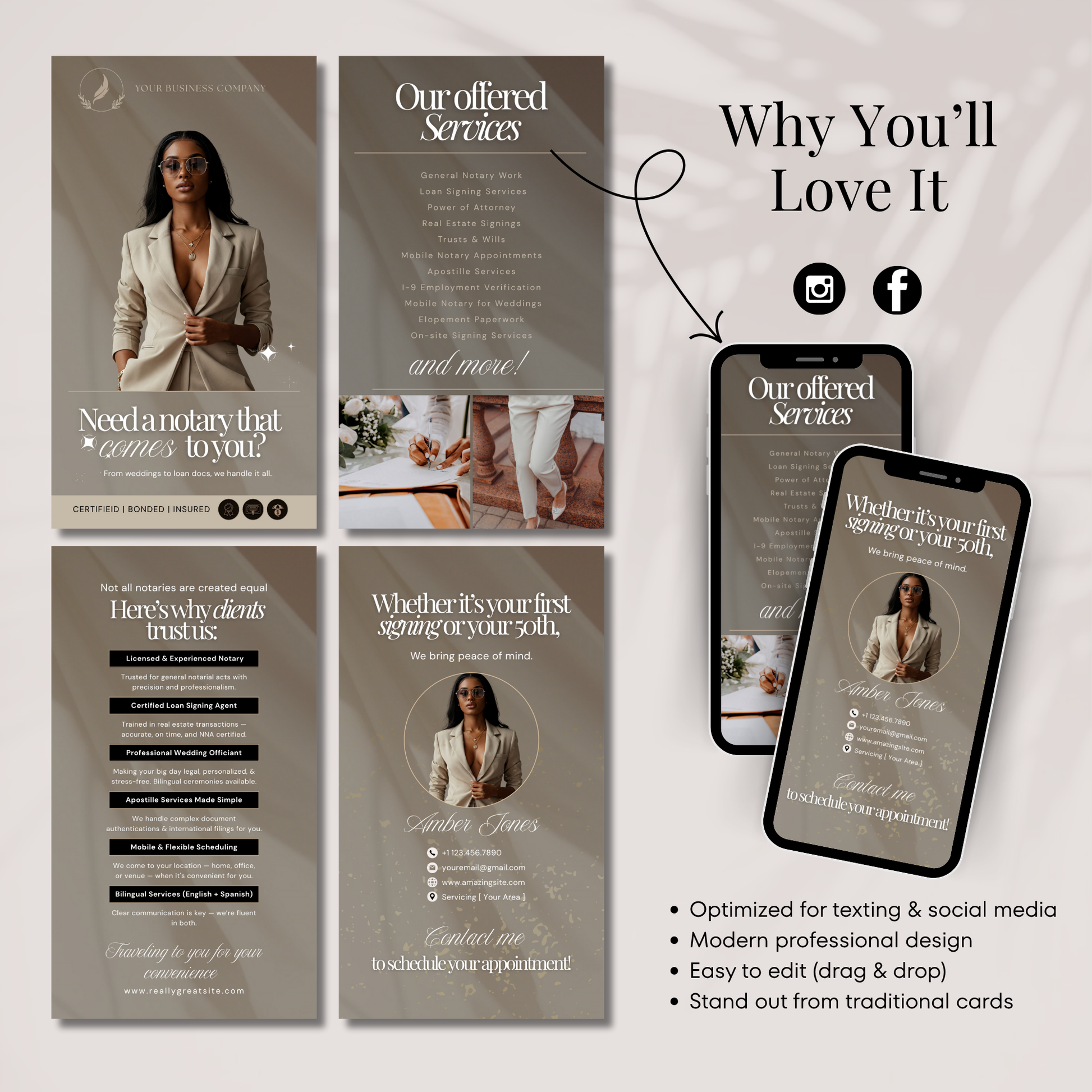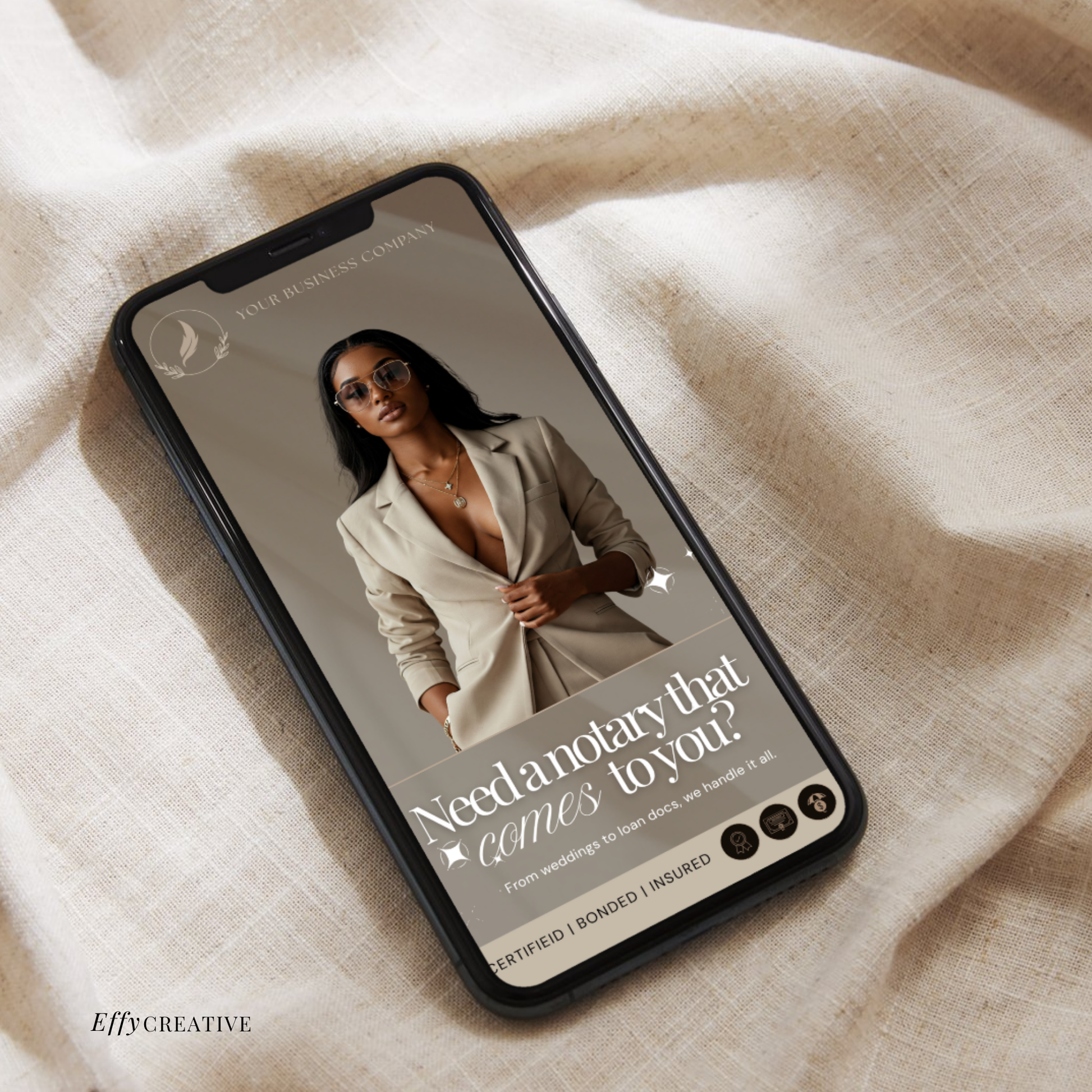 🤍 Designed to help you stand out in seconds, this digital business flyer is made for notaries who want to show up online with style and motion. Whether you're texting clients, posting on Instagram, or sharing in Facebook stories — this flyer makes you look professional, modern, and unforgettable. This digital template is editable in Canva and can be used as a PNG, PDF or MP4 for Posting, texting, emailing, or printing.