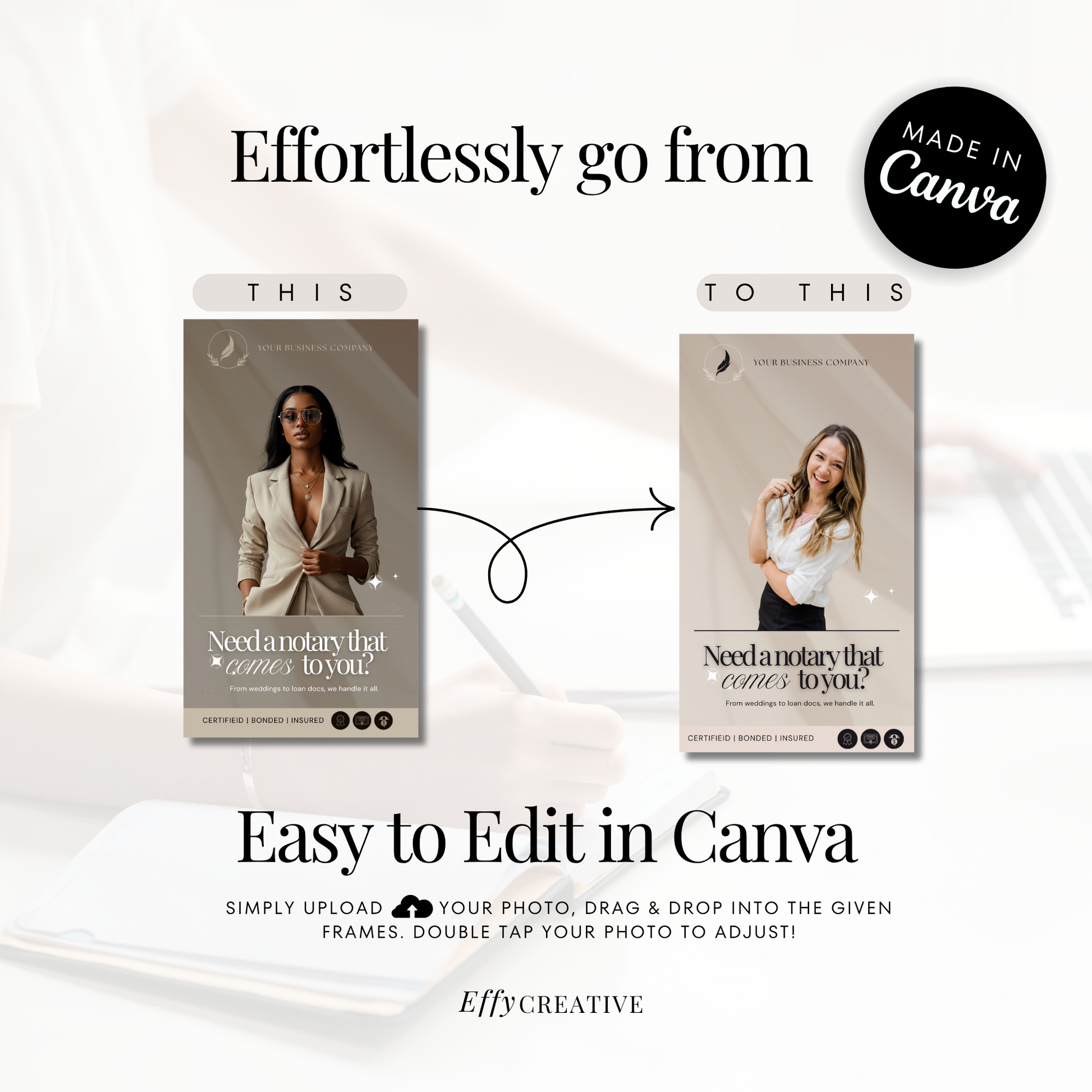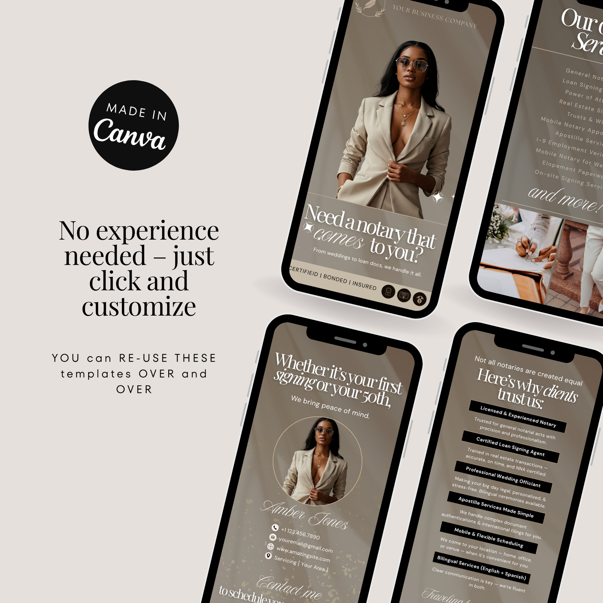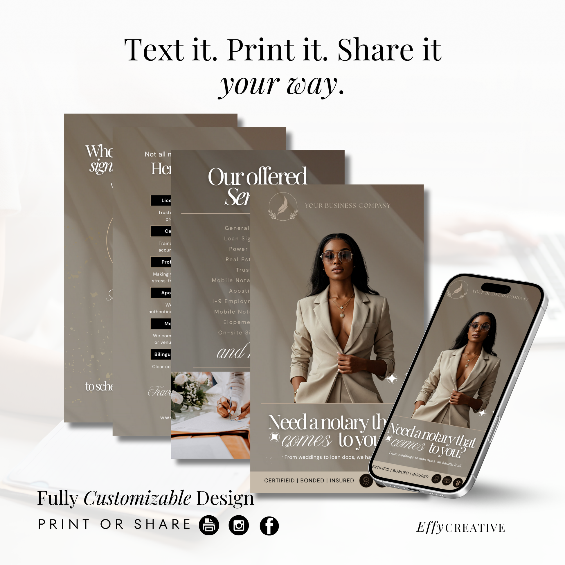 🤍 Designed to help you stand out in seconds, this digital business flyer is made for notaries who want to show up online with style and motion. Whether you're texting clients, posting on Instagram, or sharing in Facebook stories — this flyer makes you look professional, modern, and unforgettable. This digital template is editable in Canva and can be used as a PNG, PDF or MP4 for Posting, texting, emailing, or printing.