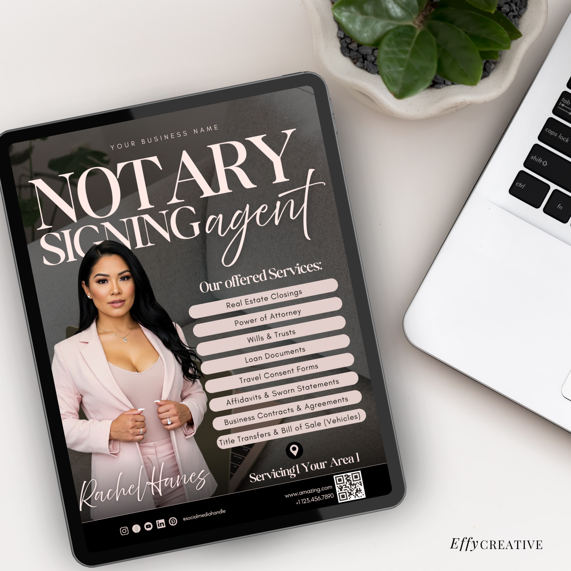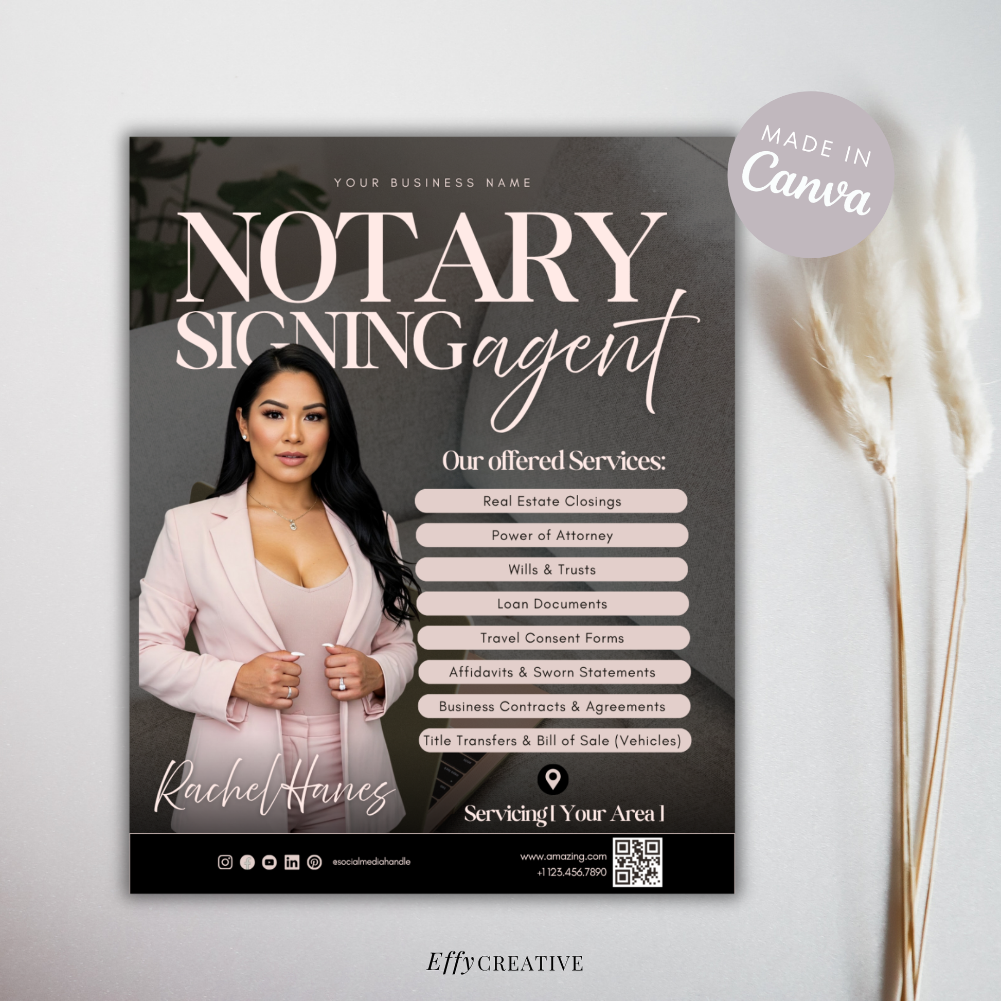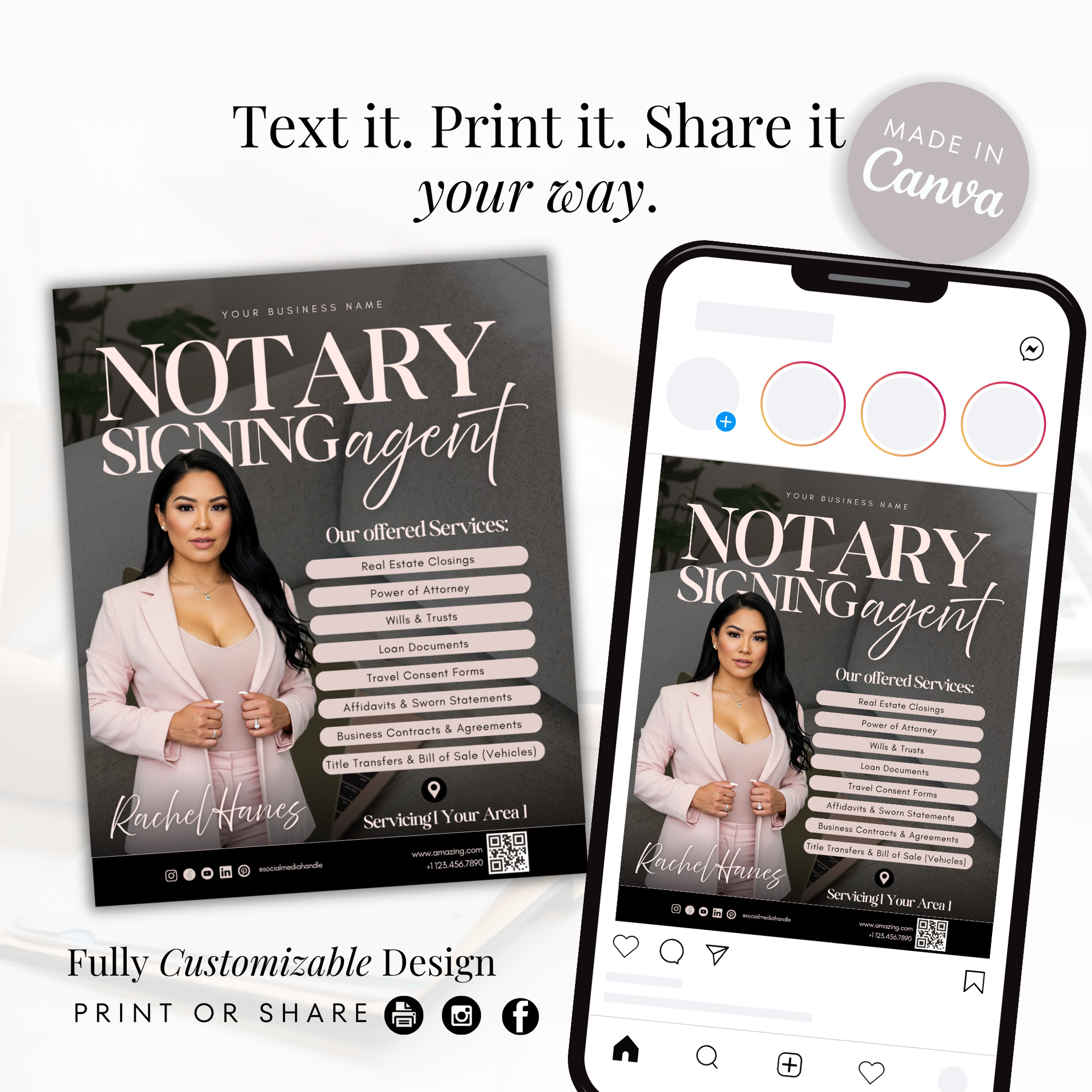 🤍 This Self-customizable Canva editable template is designed for notaries, loan signing agents, and small business owners looking to promote their services with ease and style. Whether you're offering mobile notary services, general notary work, or loan signing services, this customizable 4:5 Digital flyer helps you create a polished and professional look that attracts clients.