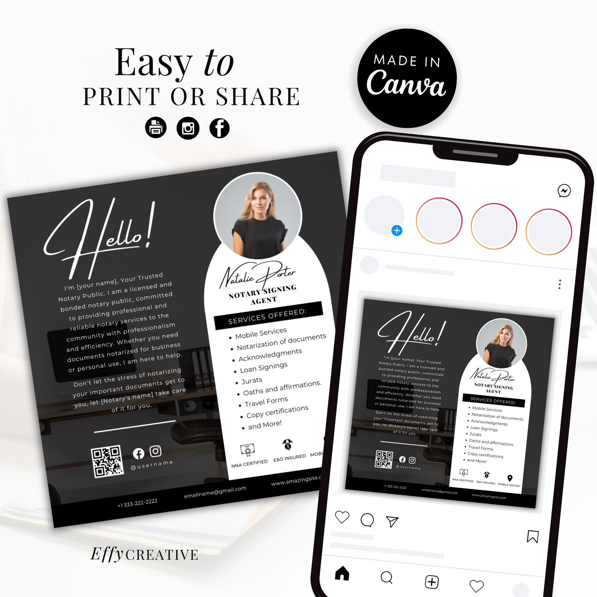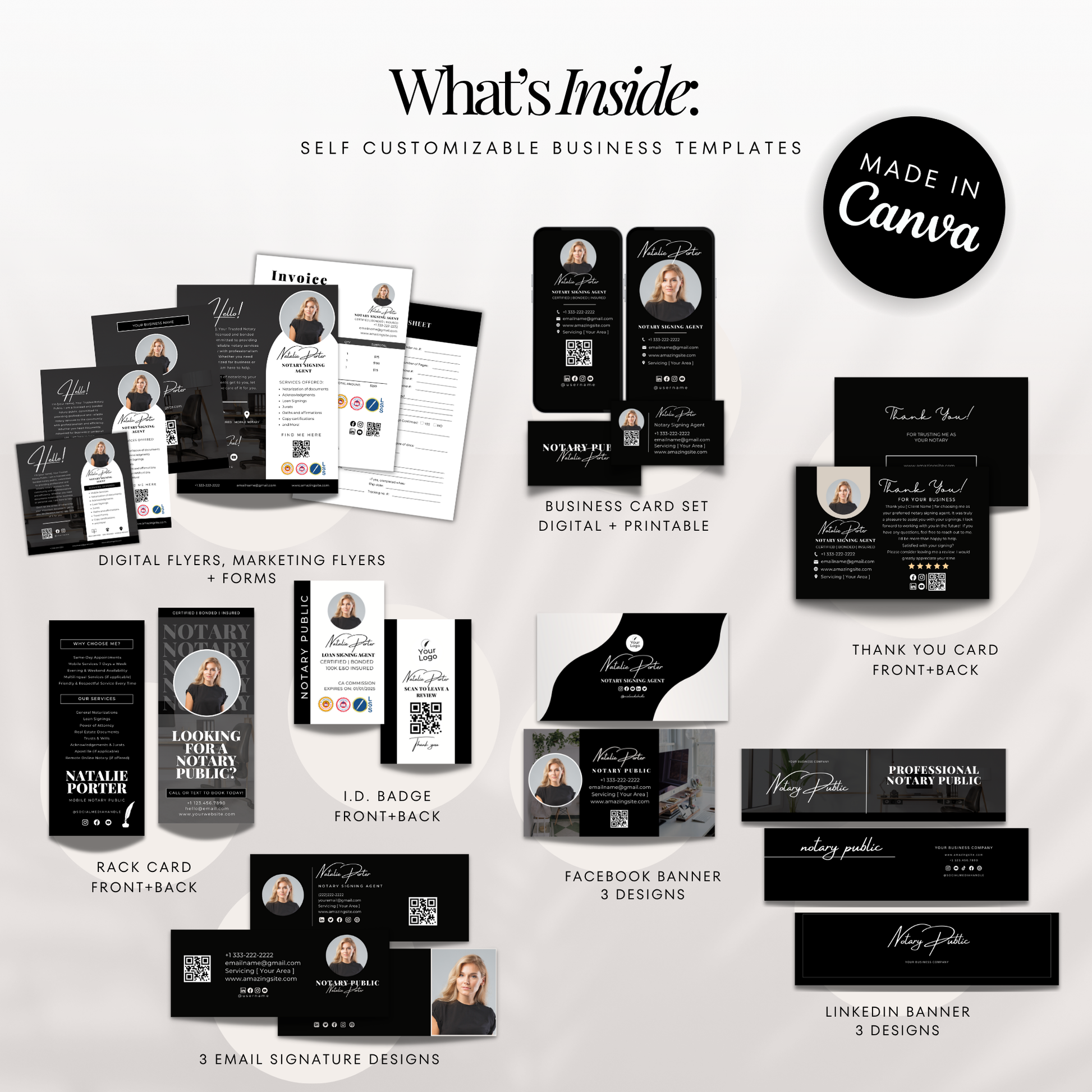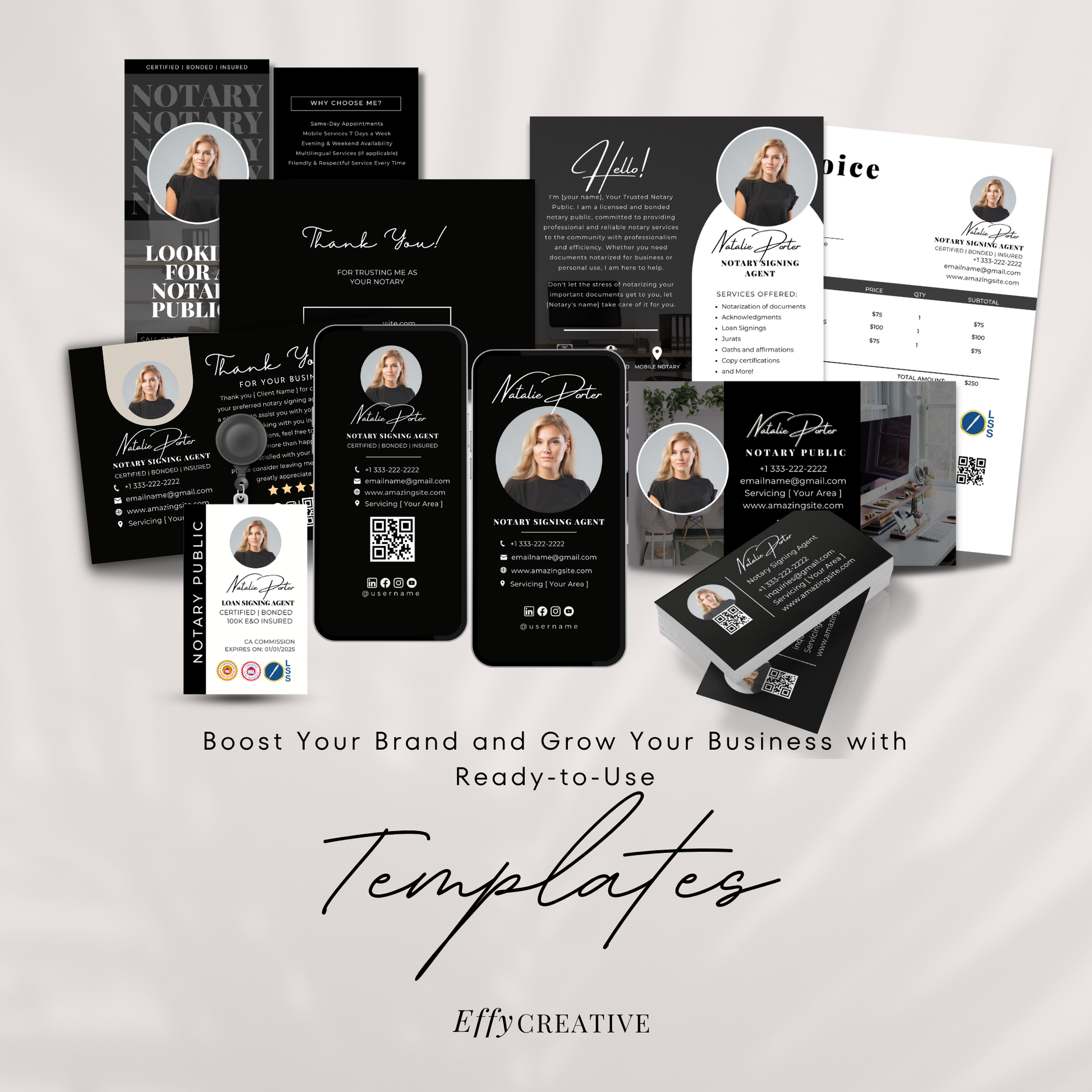 Elevate your notary business with the Notary Starter Bundle Kit, designed specifically for notaries, mobile notaries, loan signing agents, and business owners. This kit includes premade templates created in Canva, making it simple for you to customize each design to match your branding and unique style.